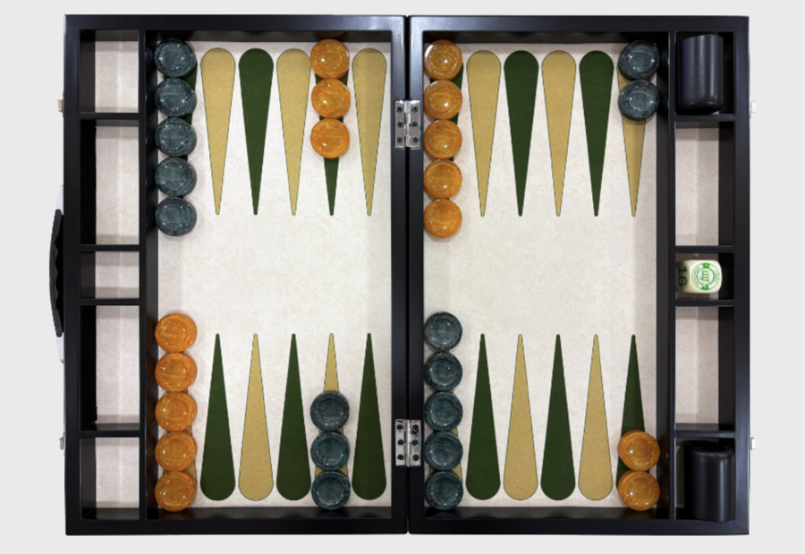 This Brazilian maker, whose brand translates to “House of Backgammon,” offers fine, luxurious sets with billiard-style felt playing surfaces, perfectly inlaid points, and solid leatherette cases. Checkers are available in ‘tournament’ sized 45mm and larger 50mm diameter options. One of the distinctive features of the Gamao boards is the stylish ‘floating’ point style, where the base of the triangles are set slightly apart from the frame, but its their disciplined color schemes that deliver consistent elegance: typically a neutral beige playing surface, with one bold accent color paired with black points. Classic.